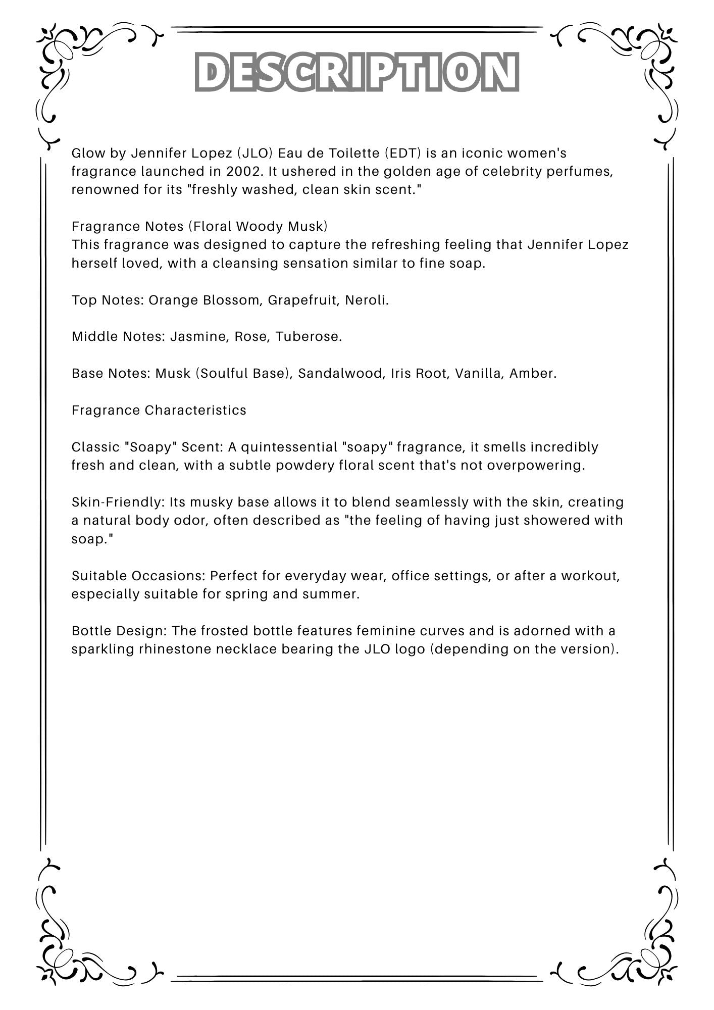 Glow by Jennifer Lopez (JLO) Eau de Toilette (EDT) is an iconic women's fragrance launched in 2002. It ushered in the golden age of celebrity perfumes, renowned for its "freshly washed, clean skin scent."