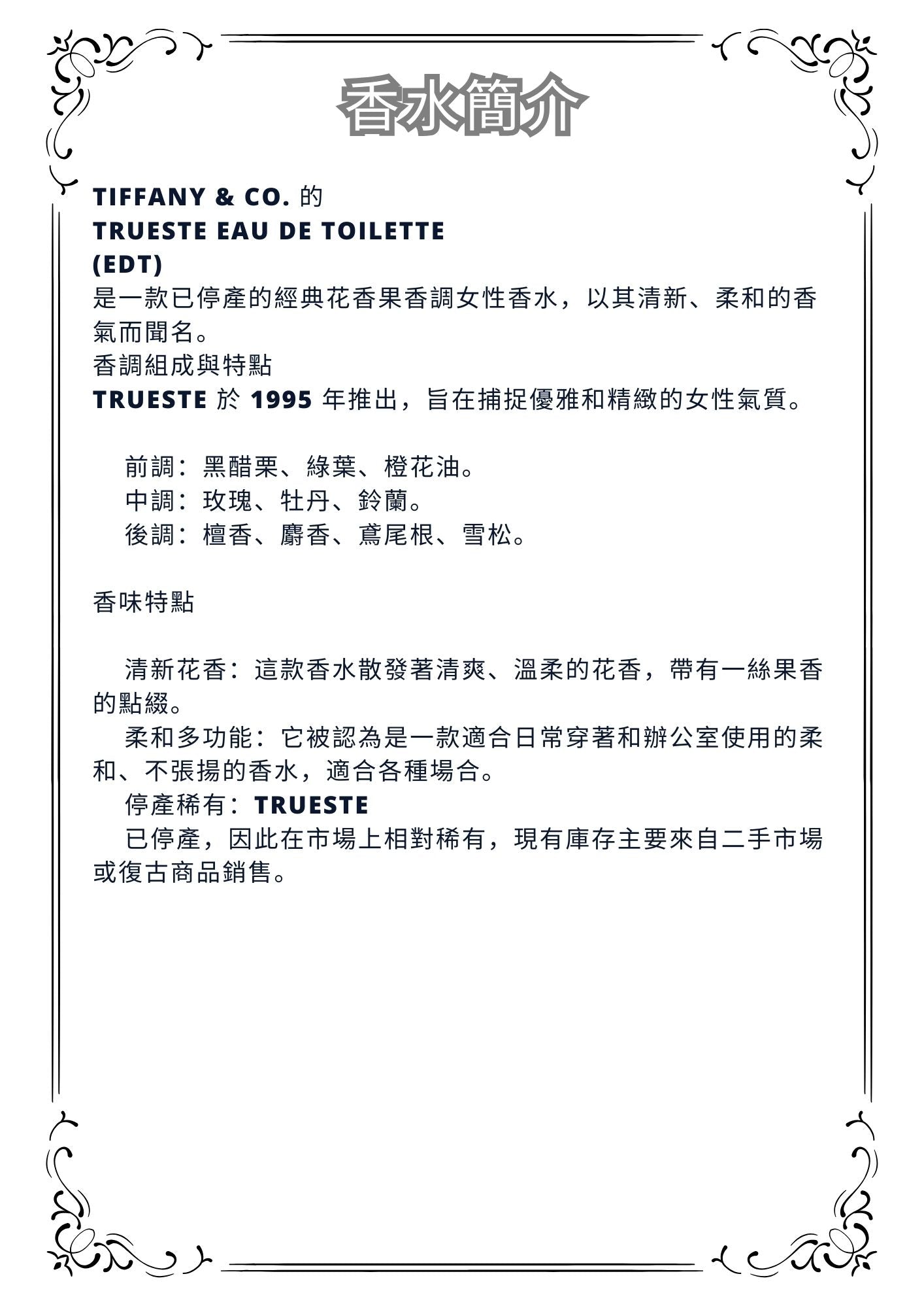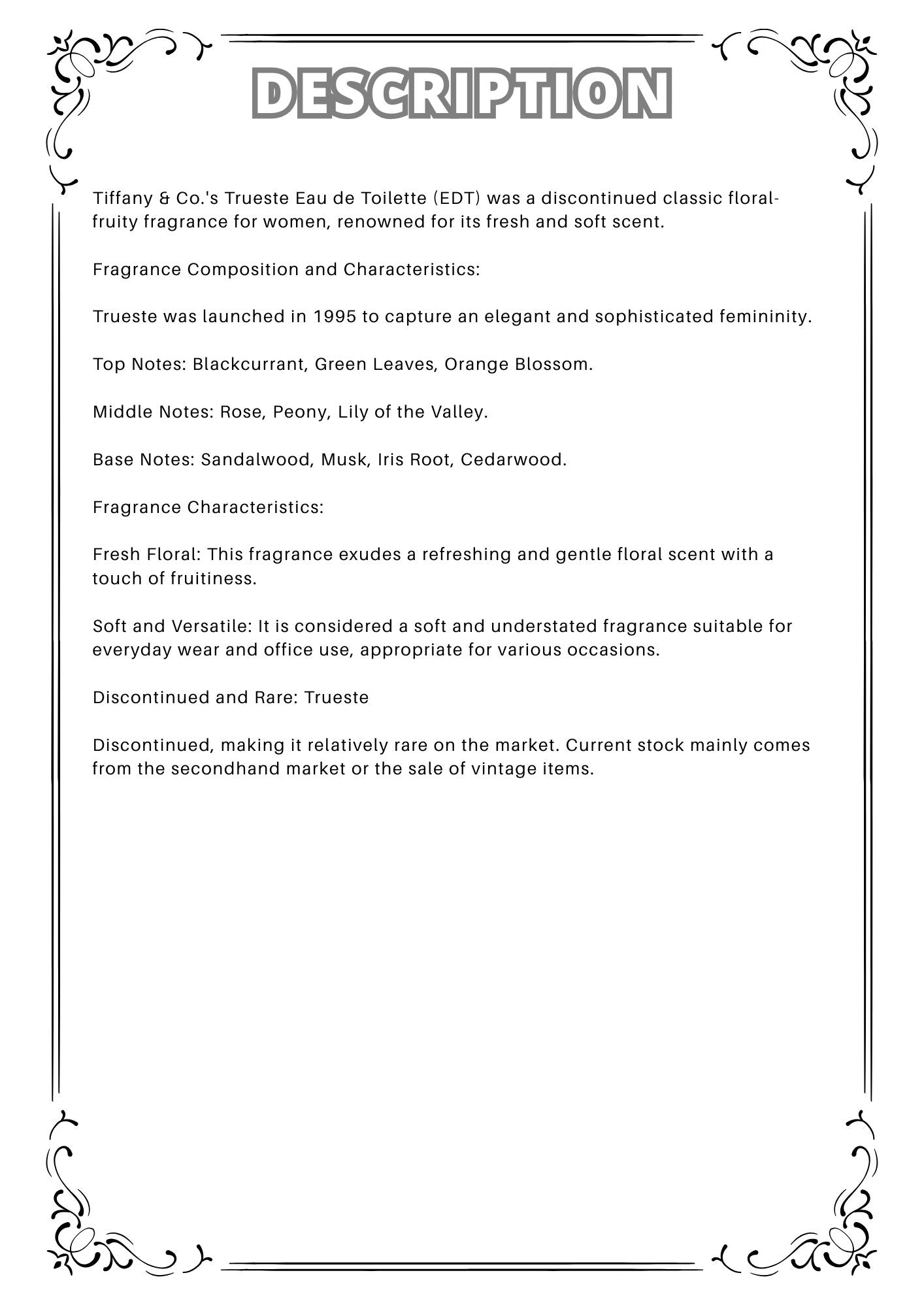 Tiffany & Co.'s Trueste Eau de Toilette (EDT) was a discontinued classic floral-fruity fragrance for women, renowned for its fresh and soft scent.