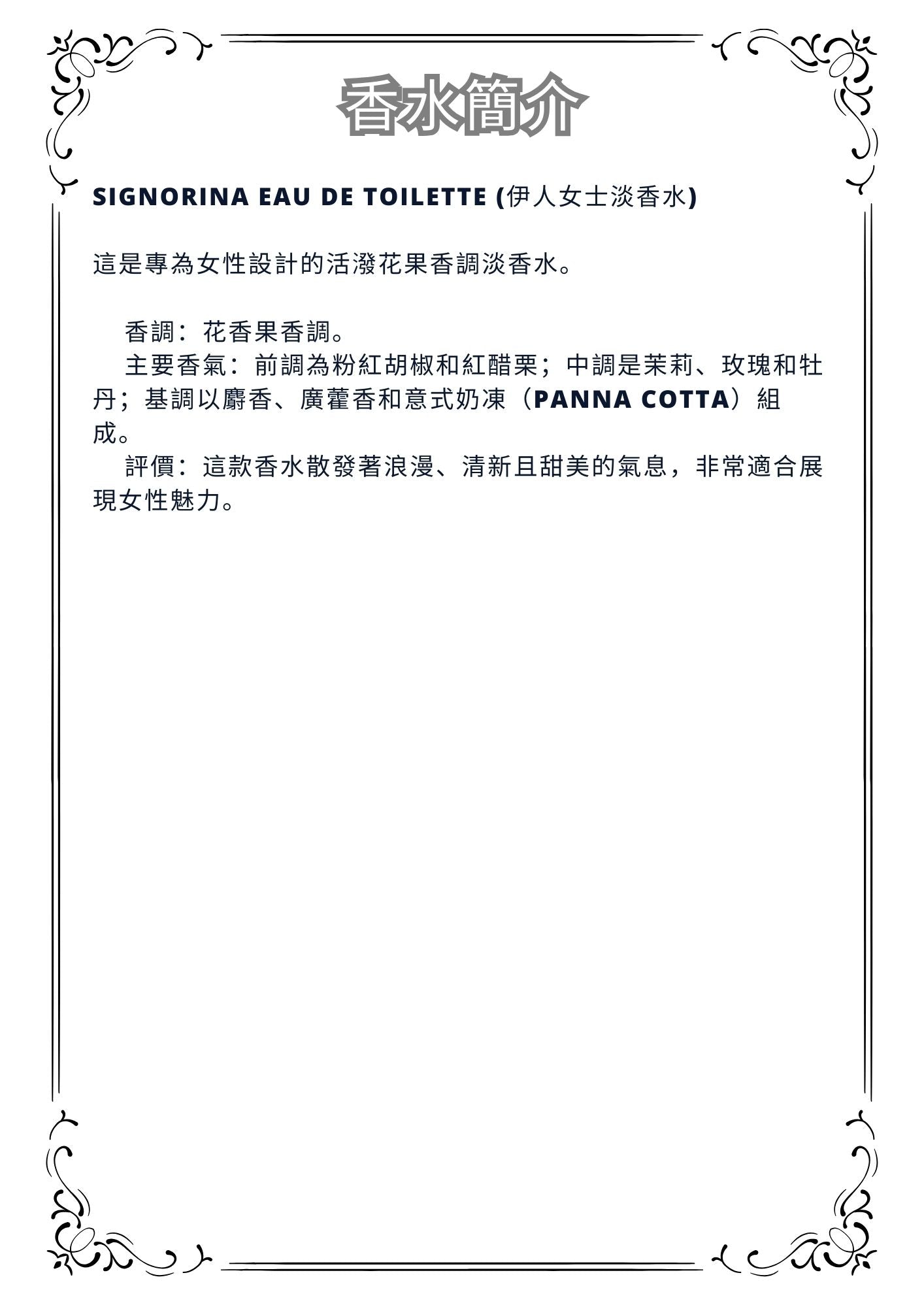 Top Notes: Pink pepper and red currant; Middle Notes: Jasmine, rose, and peony; Base Notes: Musk, patchouli, and Panna Cotta.
