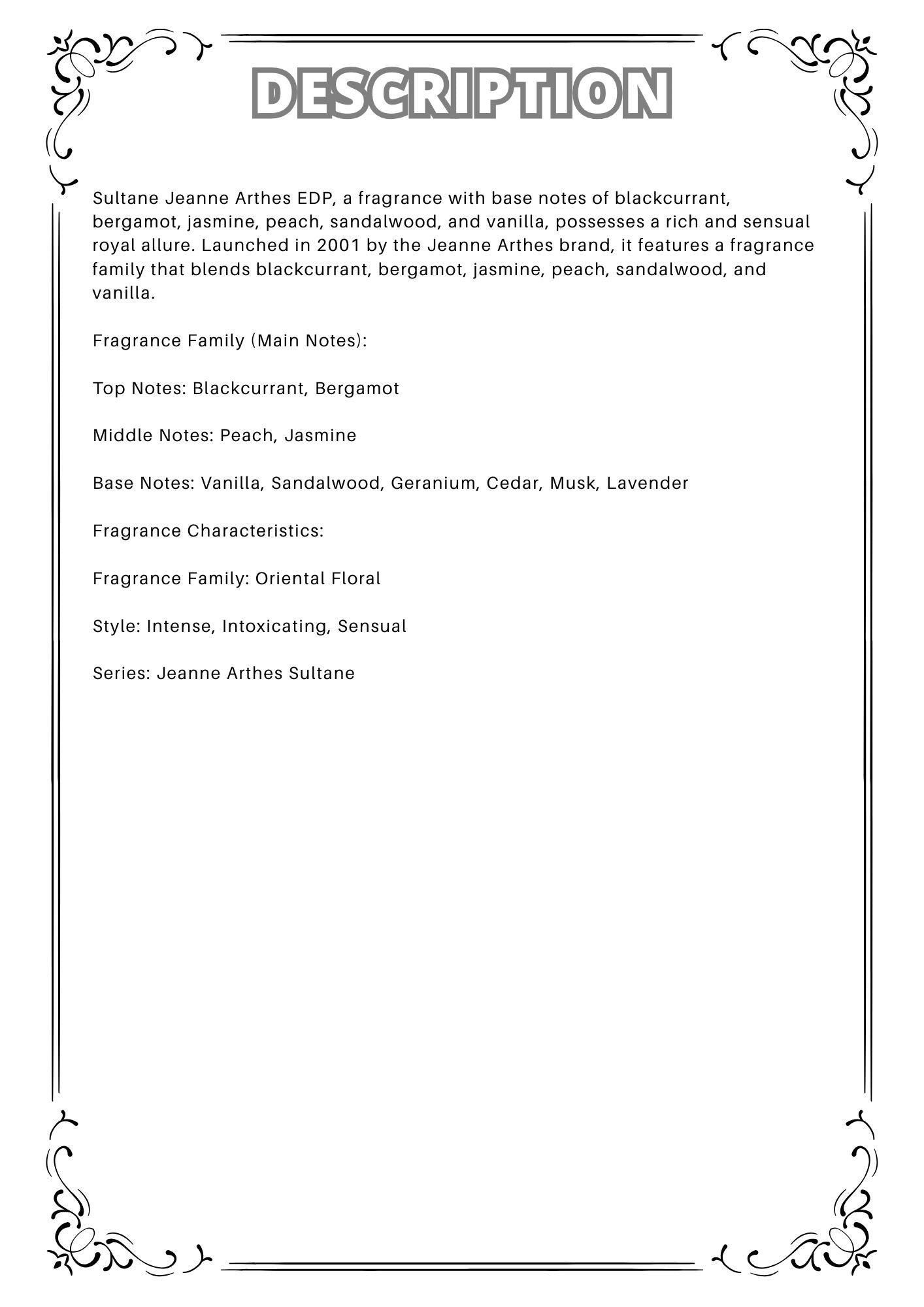 Sultane Jeanne Arthes EDP, a fragrance with base notes of blackcurrant, bergamot, jasmine, peach, sandalwood, and vanilla, possesses a rich and sensual royal allure. Launched in 2001 by the Jeanne Arthes brand, it features these notes.