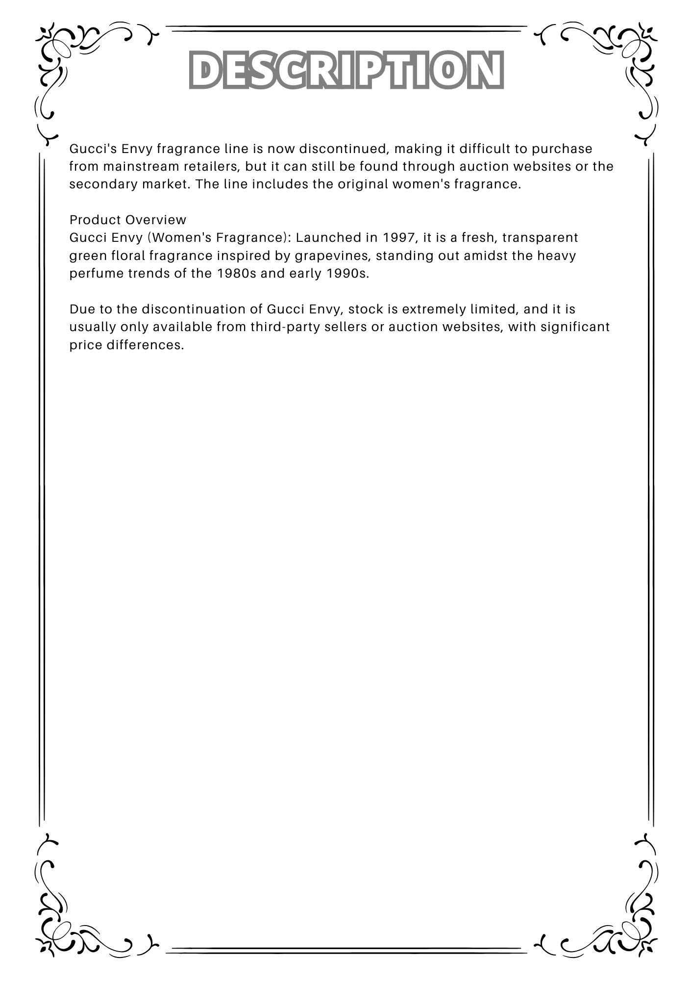 Gucci Envy (Women's Fragrance): Launched in 1997, it is a fresh, transparent green floral fragrance inspired by grapevines, standing out amidst the heavy perfume trends of the 1980s and early 1990s.